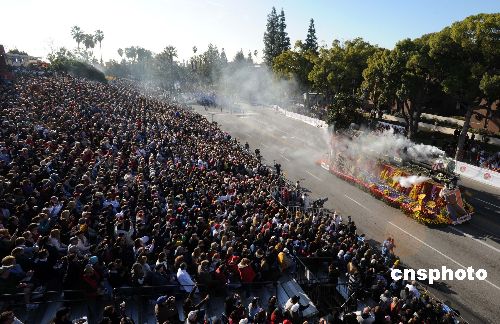 大游行吸引了來自全世界共46輛豪華花車、22個(gè)樂隊(duì)方陣和18個(gè)騎士方陣參加。帕薩迪納玫瑰花車大游行自1890年元旦舉辦以來已歷120屆,現(xiàn)已成為全美最主要的新年慶典活動(dòng)之一,與紐約時(shí)代廣場的跨年慶祝活動(dòng)齊名。中新社發(fā) 張煒 攝