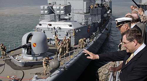 德國國防部長弗朗茨·約瑟夫·容為參加歐盟領導的打擊海盜行動的德國官兵送行。