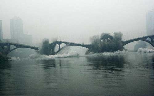 2009年1月5日上午,隨著“轟”的一聲巨響,重慶市合川區(qū)涪江一橋的橋體瞬間沉入了江底,成功地實施了爆破拆除。1971年建成的涪江一橋曾經(jīng)是國道212線上的一座跨江大橋,為川渝和當?shù)氐慕?jīng)濟的發(fā)展做出了重要的貢獻,在經(jīng)過37年的運行后終于完成了它的歷史使命。但重慶市合川區(qū)決定投入資金將在原橋位置上重新在建一座涪江一橋。新的合川涪江一橋設計為拱式橋梁,建設標準為城市主干道Ⅱ級,寬20米,雙向四車道,人行道寬3米,將于2010年12月建成通車,新的合川涪江一橋建成后將極大的改善合川區(qū)南北城現(xiàn)有的交通狀況。