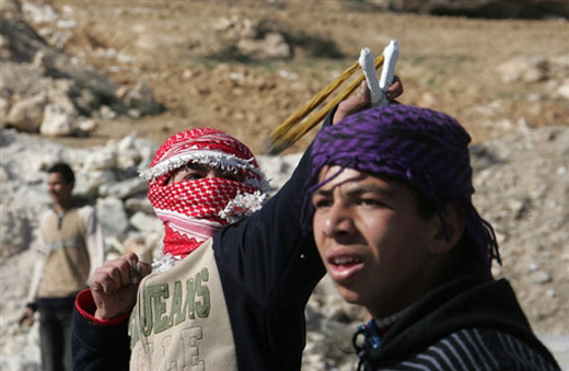 1月5日,在約旦河西岸城市希伯倫附近,巴勒斯坦少年向以色列士兵投擲石塊。當(dāng)天,一些巴勒斯坦人在這里抗議以軍對加沙的軍事行動,并與以色列士兵發(fā)生沖突。