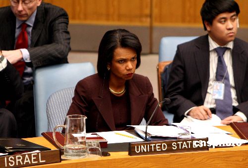 聯(lián)合國安理會(huì)一月六日晚就加沙局勢(shì)舉行緊急會(huì)議。美國國務(wù)卿賴斯出席會(huì)議。中新社發(fā) 李靜 攝