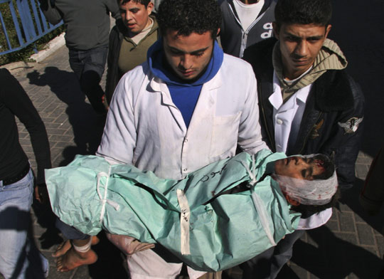 巴勒斯坦醫(yī)護(hù)人員懷抱著一具孩子的尸體。6日,以色列部隊(duì)攻擊了聯(lián)合國在加沙地區(qū)設(shè)立的學(xué)校,造成數(shù)十人死亡。