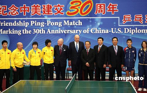 1月7日下午,“紀(jì)念中美建交30周年乒乓球友誼賽”在北京國家體育總局大廳舉行。中國外交部副部長王光亞與前來參加慶祝中美建交30周年活動(dòng)的美國副國務(wù)卿內(nèi)格羅蓬特一行觀看比賽。