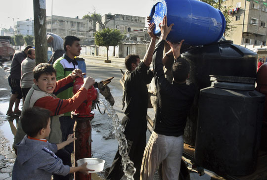以色列軍方1月7日宣布,將從當天開始每天下午1點到4點;3小時,讓加沙地帶居民置備必需物品。圖為加沙居民在;鹌陂g抓緊補充用水。