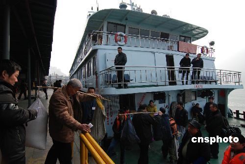 2009年1月8日,在三峽重慶庫區(qū)云陽縣港務(wù)站碼頭,旅客乘船出行。長江航務(wù)部門近日傳出消息,今年春運三峽庫區(qū)將投入跨省客船109艘、43115個客位,預(yù)計春運期間跨省運送旅客42萬人次。有關(guān)部門將在1月10日前完成參運船舶的安全檢驗。中新社發(fā) 劉小洋 攝
