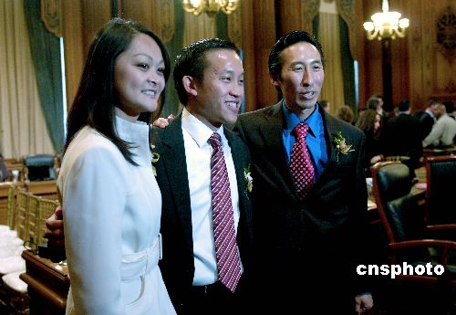 當(dāng)?shù)貢r(shí)間一月八日,舊金山市議會(huì)當(dāng)選議員宣誓就職,并選舉出舊金山歷史上首位華裔議會(huì)主席邱信福。舊金山市歷史上首次同時(shí)出現(xiàn)三位華裔議員邱信福(中)、朱嘉文(左)和馬兆光。圖為三位華裔議員宣誓后合影。中新社發(fā) 陳鋼 攝
