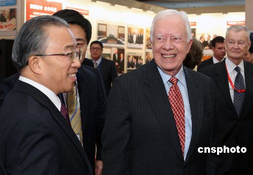 1月12日,中國(guó)國(guó)務(wù)委員戴秉國(guó)在北京陪同來訪的美國(guó)前總統(tǒng)吉米·卡特先生,參觀中美建交30周年圖片展覽,重溫兩國(guó)建交歷史。中新社發(fā) 宋吉河 攝