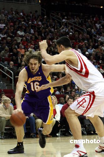 圖為姚明防守湖人隊加索爾。中新社發(fā) 歐文 攝