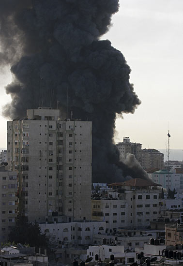 聯(lián)合國近東巴勒斯坦難民救濟和工程處位于加沙城的辦公地點遭以軍炮擊后煙霧沖天。