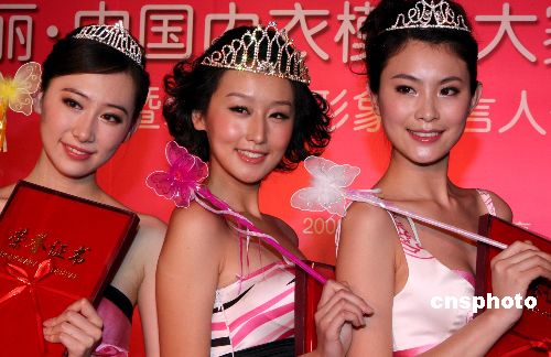 1月20日晚,2009“愛美麗中國(guó)內(nèi)衣模特大賽”啟動(dòng)儀式暨 “愛美麗”形象代言人簽約儀式在北京拉開序幕,獲得2008中國(guó)內(nèi)衣模特大賽冠、亞、季軍的3位“愛美麗天使”也作為愛美麗的代言人驚艷亮相。圖為冠、亞、季軍的選手。 中新社發(fā) 錢興強(qiáng) 攝