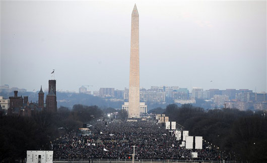 美國(guó)當(dāng)?shù)貢r(shí)間1月20日上午,華盛頓林肯紀(jì)念堂前的國(guó)家大草坪上擠滿了前來(lái)參加奧巴馬就職典禮的民眾。