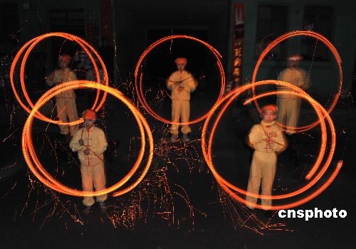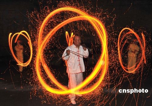 近日,山西太原晉陽“風(fēng)火流星”民間社火表演在晉源老城舉行,迎接元宵節(jié)的到來,表演者中年齡最大的51歲,年齡最小的僅10歲,他們將“風(fēng)火流星”表演得火花四濺,形成各種各樣的圖案,贏得了當(dāng)?shù)卮迕竦年囮嚭炔!帮L(fēng)火流星”俗稱“火流星”,是一門融民間雜技與中華武術(shù)為一體的民間社火表演,表演者表演時(shí)持有刀、槍、棍、棒、流星錘、三三叉等兵器,表演套路有雙龍開道、火龍纏身、悟空舞棍、左輪擋矛、空中閃電、火龍十八滾等,可單人或多人表演,行、站、坐、臥、翻滾,人在火中,火圍人轉(zhuǎn)。