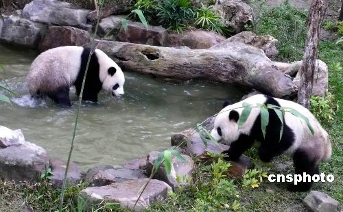 圖為“團(tuán)團(tuán)”“圓圓”在戶外展場的水池內(nèi)戲水玩耍。中新社發(fā) 路梅 攝