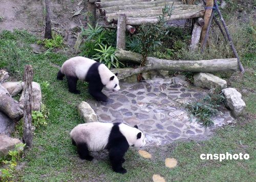 圖為“團(tuán)團(tuán)”“圓圓”在戶外展場閑庭信步。中新社發(fā) 路梅 攝