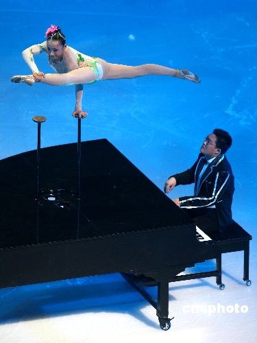 圖為在開(kāi)幕式上,鋼琴上的雜技演出技驚四座。中新社發(fā) 富田 攝
