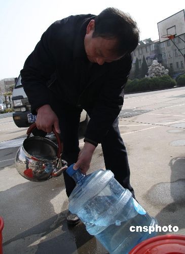 2月21日,江蘇省鹽城市各主干道上,消防車輛正為市民輸送安全用水,確保鹽城市民能夠安心喝上未被污染的自來(lái)水。由于水廠受酚類化合物污染,鹽城市區(qū)2月20日出現(xiàn)大面積停水,居民生活受到較大影響。造成本次停水的水源地污染原因已經(jīng)確認(rèn),偷排污水的鹽城標(biāo)新化工有限公司被責(zé)令關(guān)閉,法人代表等相關(guān)責(zé)任人被采取強(qiáng)制措施。圖為鹽城市市委黨校內(nèi)前來(lái)取水的市民用純凈水桶取水。中新社發(fā) 童盛 攝