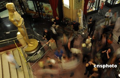 當(dāng)?shù)貢r(shí)間二月二十日,大批游客在好萊塢柯達(dá)劇場入口處的奧斯卡金像模型前留影。全球影迷矚目的第八十一屆奧斯卡電影金像獎(jiǎng)?lì)C獎(jiǎng)典禮將于二十二日晚在這里舉行,柯達(dá)劇場內(nèi)外打扮一新,通往劇場的巨大紅地毯已經(jīng)鋪就,各項(xiàng)準(zhǔn)備工作基本就緒。中新社發(fā) 張煒 攝