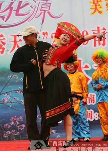 身著壯鄉(xiāng)美女服飾的芙蓉姐姐擺出經(jīng)典的S造型。鄧昶 攝