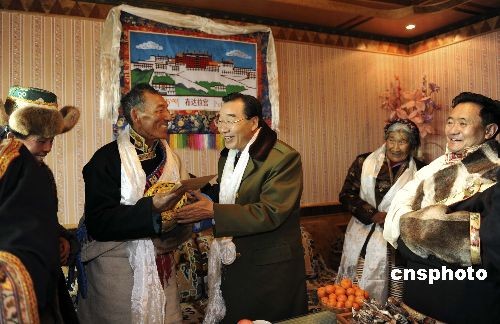 2月25日,中國藏歷年初一,西藏自治區(qū)黨委書記張慶黎冒著風(fēng)雪來到拉薩市城關(guān)區(qū)納金鄉(xiāng)嘎巴村拜年,與村民多布杰一家人共慶藏歷新年。中新社發(fā) 廖攀 攝
