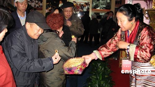 圖:藏族同胞向參觀展覽的觀眾派發(fā)禮品