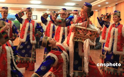 2月25日是藏歷新年初一,甘肅省甘南藏族自治州合作地區(qū)的藏族官員和民眾匯集甘南飯店舉行聯(lián)歡會,慶祝新年。圖為甘南州歌舞劇院表演舞蹈《祝福吉祥》。中新社發(fā) 殷春永 攝