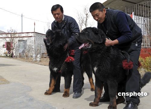 2009年春,西藏拉薩市郊,西藏藏獒協(xié)會(huì)養(yǎng)殖基地兩頭名為“喜馬”和“拉雅”的喜馬拉雅河谷型藏獒嬉戲。曾有客戶出價(jià)數(shù)百萬元人民幣都未能如愿能買走“喜馬”。據(jù)了解,全世界像“喜馬”這樣的純血統(tǒng)藏獒不到200只,全西藏也只有20只左右。 牦牛、禿鷲與藏獒被稱為西藏三寶。中新社發(fā) 廖攀 攝