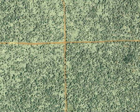 剛果森林:本圖由IKONOS商業(yè)衛(wèi)星攝于2002年6月27日,顯示的是剛果共和國北部的森林。圖中劃過中心的桔色線條是骯臟的運(yùn)送木材的公路。