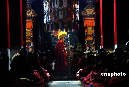 3月4日,中國藏歷新年正月初八,西藏拉薩哲蚌寺,“鐵棒喇嘛”在措欽大殿舉行的傳昭大法會上!拌F棒喇嘛”藏名:“格貴”,負責維持僧團清規(guī)戒律的寺院執(zhí)事,歷史上藏傳佛教各大寺院的糾察僧官巡視僧紀時,常隨身攜帶鐵杖,故有“鐵棒喇嘛”之俗稱。中新社發(fā) 廖攀 攝