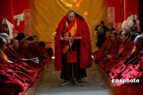 3月4日,藏歷新年正月初八,拉薩色拉寺舉行傳昭大法會,僧人們會進(jìn)行傳統(tǒng)的辯經(jīng)、祈愿、頌經(jīng)等佛事活動。每年的傳昭大法會從藏歷正月初八開始,持續(xù)到藏歷正月十五。圖為在色拉寺大殿內(nèi)高僧在進(jìn)行誦經(jīng)。中新社發(fā) 劉震 攝