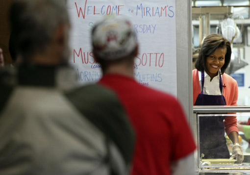 3月5日,美國(guó)總統(tǒng)奧巴馬的夫人米歇爾在白宮附近的一家慈善廚房幫廚,以自己的實(shí)際行動(dòng)來(lái)號(hào)召更多的人在經(jīng)濟(jì)不景氣的當(dāng)下,投入到義工服務(wù)中來(lái)。這家名為米里亞姆的施湯所距白宮不遠(yuǎn)。當(dāng)天,米歇爾在她的時(shí)尚外衣上罩上圍裙,并戴上塑料手套,做意大利蘑菇調(diào)味飯和水果沙拉。
