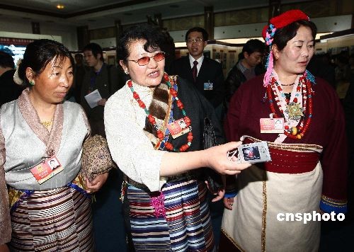 3月8日,參加全國人大會議的西藏團藏族女代表參觀在北京民族宮舉辦的西藏民主改革50年大型展覽。中新社發(fā) 杜洋 攝