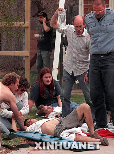 1999年4月,美國科羅拉多州利特爾頓市哥倫拜恩中學(xué)18歲的學(xué)生埃里克·哈里斯和17歲的迪倫·克萊博爾德槍殺了1名教師和12名同學(xué),然后飲彈自盡。這是1999年4月20日,救護人員在哥倫比恩中學(xué)搶救槍擊案中的受傷者。