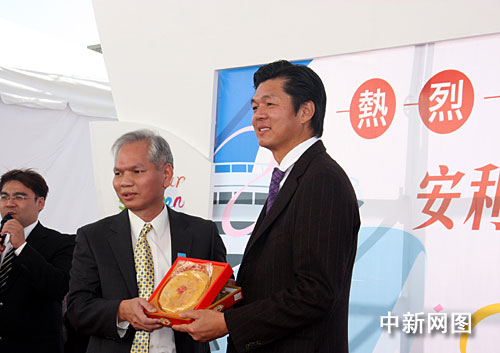 圖為臺(tái)灣海峽兩岸觀光旅游協(xié)會(huì)秘書長吳朝彥向安利大中華區(qū)行政總裁顏志榮致贈(zèng)臺(tái)北縣新莊百年老店的傳統(tǒng)喜餅。