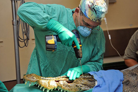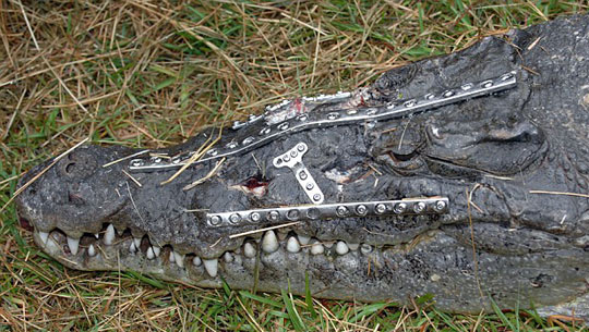 據(jù)英國媒體3月18日報道,美國佛羅里達動物園一只受傷的大鱷魚,經(jīng)過手術(shù),頭部被41枚釘子以及4塊鐵板固定,現(xiàn)在被人戲稱為“機器鱷魚”。這只長達10英尺的鱷魚是在一起車禍事故中受傷的。經(jīng)醫(yī)生介紹,現(xiàn)在鱷魚的恢復情況良好。
