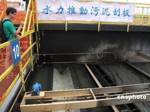 香港特區(qū)政府渠務(wù)署在迎來成立二十周年之際,于二零零九年三月二十一日向市民開放昂船洲污水處理廠,展示污水凈化處理過程,介紹和體驗港府正斥巨資推行的凈化海港計劃。圖為市民觀看污水進(jìn)入沉淀池后,水力推動的污泥刮板在水面上層刮起一層層黑臭污垢的過程。 中新社發(fā) 余瑞冬 攝