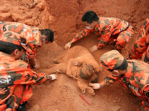 鄒森的這張照片,反映了地震對(duì)人類(lèi)摧殘,同時(shí)也反映了生死瞬間母親的偉大。這張照片感動(dòng)著世界。照片中的這位母親叫文學(xué)金,和女兒在“8.30”地震中遇難。