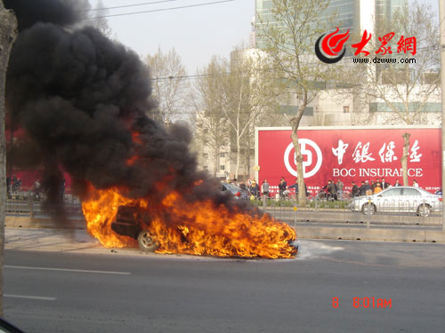 7:45,記者行至歷山路大潤發(fā)北側(cè),突然聞到前方傳來一股濃烈的焦糊味,立即向前奔去,跑至歷山路與和平路路口南側(cè)30米處,看到一輛車號為魯A77XX8的轎車著起了熊熊大火,發(fā)出噼噼啪啪的聲音,濃濃的黑煙騰空而起足有十幾米高,俄頃就彌漫方圓數(shù)十米。周圍的車輛在交警的指揮下紛紛繞行外道,躲避大火。大約4分鐘后,消防車從北面呼嘯而至,消防人員動用兩支水槍、左右夾擊,大約2分鐘后就將大火撲滅。此時,自燃轎車已經(jīng)燒得面目全非,只剩下黑乎乎的框架。記者上前查看,看到轎車里面還放著成堆的紙制品。