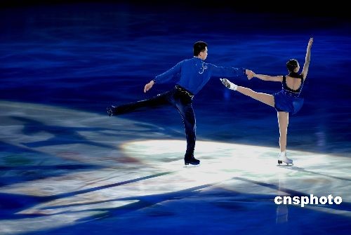 2009年4月12日晚,第十一屆全國(guó)運(yùn)動(dòng)會(huì)青島市賽區(qū)組委會(huì)在國(guó)信體育館舉行了花樣滑冰優(yōu)秀運(yùn)動(dòng)員專場(chǎng)表演晚會(huì)。獲得男、女單人滑、雙人滑、冰舞的前四名選手悉數(shù)登場(chǎng),在絢麗多彩的燈光和音樂(lè)伴奏下,為觀眾獻(xiàn)上了精彩絕倫的表演。至此,第十一屆全國(guó)運(yùn)動(dòng)會(huì)花樣滑冰比賽完美謝幕。中新社發(fā) 楚天行 攝