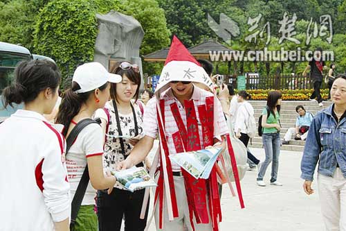 24日,湖北武漢黃陂木蘭山天池景區(qū)門(mén)前,一男子頭戴尖帽,身上掛滿紅紙條,在熙熙攘攘的人流中十分顯眼。該男子稱(chēng),他正為一家“農(nóng)家樂(lè)”酒店做宣傳,游客憑著他身上的紙條消費(fèi),可享受優(yōu)惠。據(jù)介紹,近年來(lái)木蘭景區(qū)游客量大增,“農(nóng)家樂(lè)”如雨后春筍冒出,競(jìng)爭(zhēng)激烈。