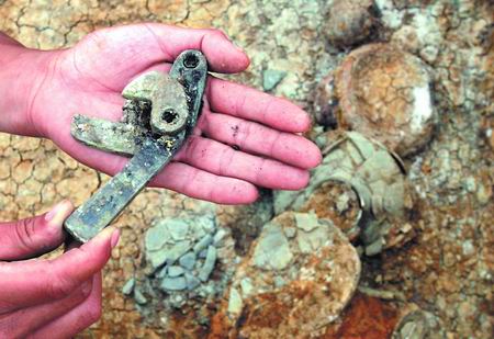 記者還在現(xiàn)場(chǎng)看到一個(gè)銅質(zhì)弩機(jī)殘件。周科華告訴記者,弩機(jī)是射箭的工具,為戰(zhàn)國(guó)晚期器物,可能是目前發(fā)現(xiàn)的最早的銅質(zhì)弩機(jī),考古價(jià)值極大。另外,還有鐵劍、鐵斧、蒜頭壺、陶罐、陶俑等也較有特色。