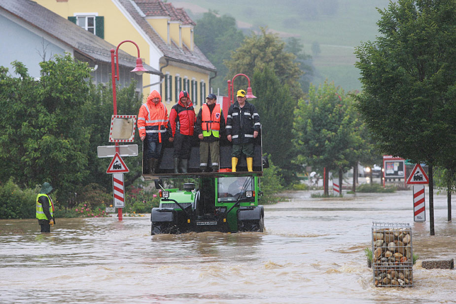6月24日,奧地利部分地區(qū)由于連日降雨發(fā)生洪災(zāi)。當(dāng)?shù)叵廊藛T緊急出動(dòng),用各種工具將災(zāi)民運(yùn)往安全地帶。