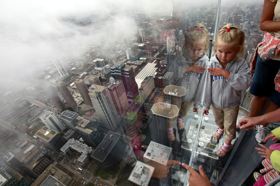 7月1日,美國(guó)芝加哥,西爾斯大廈在第103層瞭望臺(tái)增設(shè)的玻璃陽(yáng)臺(tái)對(duì)媒體開(kāi)放。這些玻璃陽(yáng)臺(tái)建在大廈西側(cè),從瞭望臺(tái)向外延伸約1.2米。陽(yáng)臺(tái)的玻璃地板厚達(dá)12.7厘米,可承重約5噸。