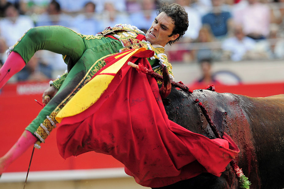 7月5日,西班牙巴塞羅那舉行了一場(chǎng)驚險(xiǎn)的斗牛比賽,一位斗牛士在與牛較量時(shí)被牛頂起,所幸該人“武功”高強(qiáng)未造成大的傷害。