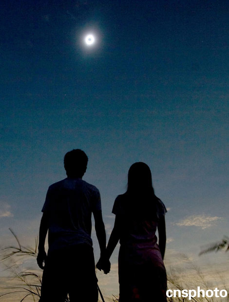 2009年7月22日9時23分,一對情侶在湖北省潛江市觀看日全食。 中新社發(fā) 程欣 攝
