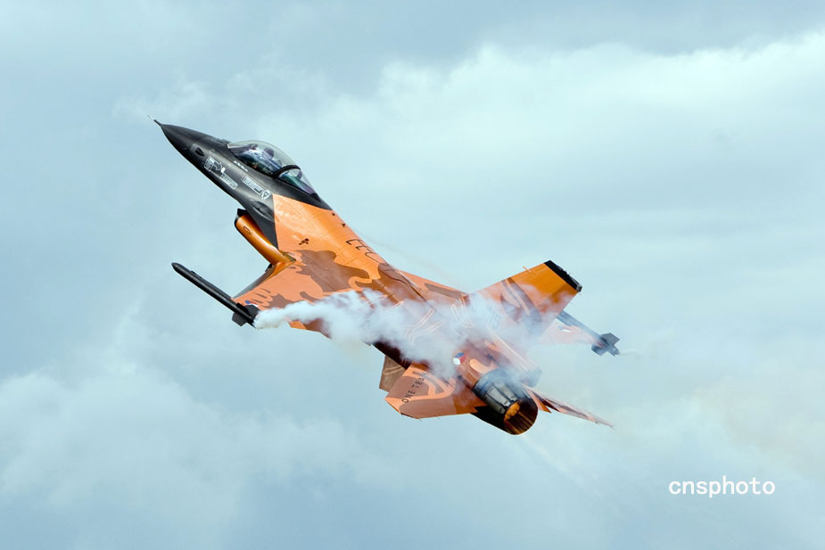 2009年7月,“2009英國(guó)費(fèi)爾福德航展”在英格蘭費(fèi)爾福德開展。圖為荷蘭皇家空軍F-16戰(zhàn)斗機(jī),荷蘭皇家空軍此次以少見的橙色圖裝F-16戰(zhàn)斗機(jī)在航展上亮相。中新社發(fā) 潘禹 攝