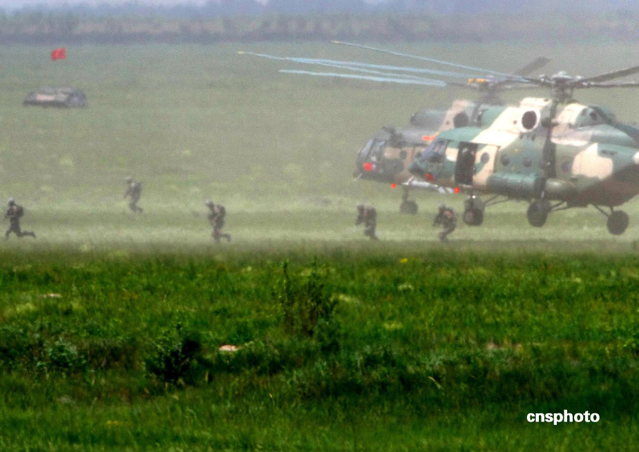 中國、俄羅斯兩軍總參謀長,7月23日上午到沈陽軍區(qū)洮南合同戰(zhàn)術訓練基地,觀看“和平使命2009”聯(lián)合反恐軍事演習。雙方以陸軍和空軍為主,中方參演部隊包括1個陸軍戰(zhàn)斗群和1個空軍戰(zhàn)斗群。俄方參演兵力包括1個陸軍加強摩步營、1個空降突擊連和部分空軍兵力,雙方投入兵力兩千多人。中新社發(fā) 宋吉河 攝