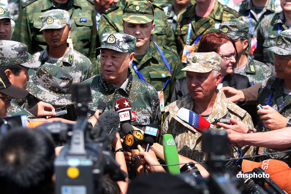 中國、俄羅斯兩軍總參謀長,7月23日上午到沈陽軍區(qū)洮南合同戰(zhàn)術(shù)訓(xùn)練基地,觀看“和平使命2009”聯(lián)合反恐軍事演習(xí)。雙方以陸軍和空軍為主,中方參演部隊包括1個陸軍戰(zhàn)斗群和1個空軍戰(zhàn)斗群。俄方參演兵力包括1個陸軍加強摩步營、1個空降突擊連和部分空軍兵力,雙方投入兵力兩千多人。中新社發(fā) 宋吉河 攝