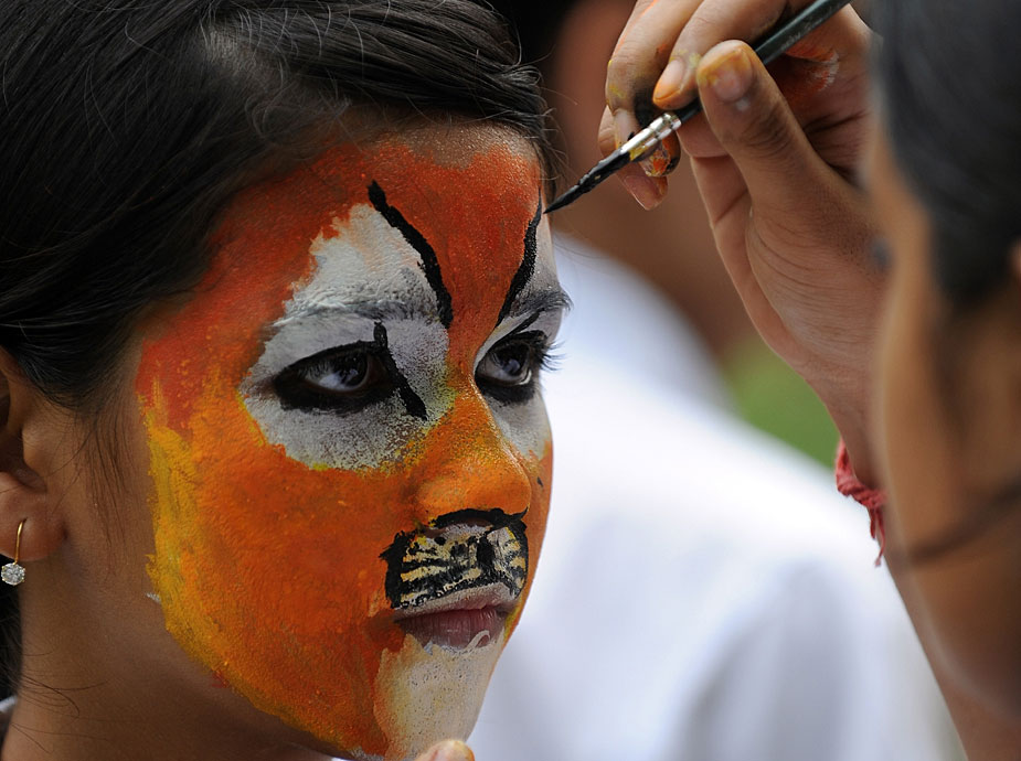 7月28日,約2000名學(xué)生在新德里化妝成老虎的臉譜,圍坐成老虎的造型,與官員和野生動物專家們一起呼吁人們保護(hù)孟加拉虎和其他野生動物。