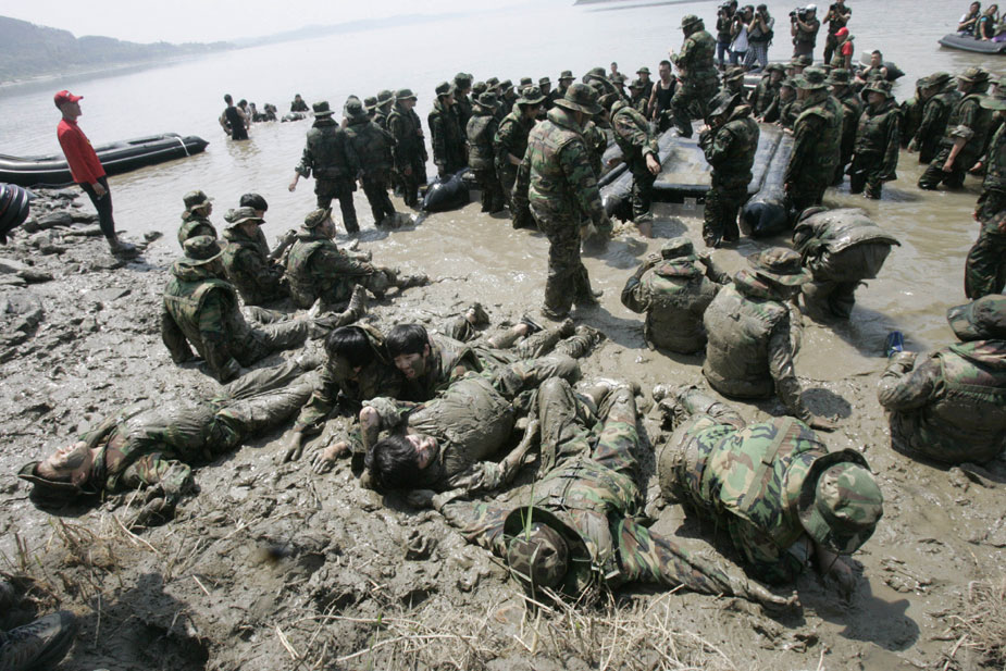 當地時間7月30日,在首爾的美軍基地參加軍訓夏令營的韓國數百名學生來到金浦進行了泥地訓練,場面十分激烈甚至殘酷。