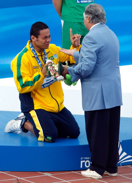 “能再給我一塊嗎?”——7月29日,巴西選手席爾瓦獲得男子50米蛙泳銀牌后長(zhǎng)跪在領(lǐng)獎(jiǎng)臺(tái)上。